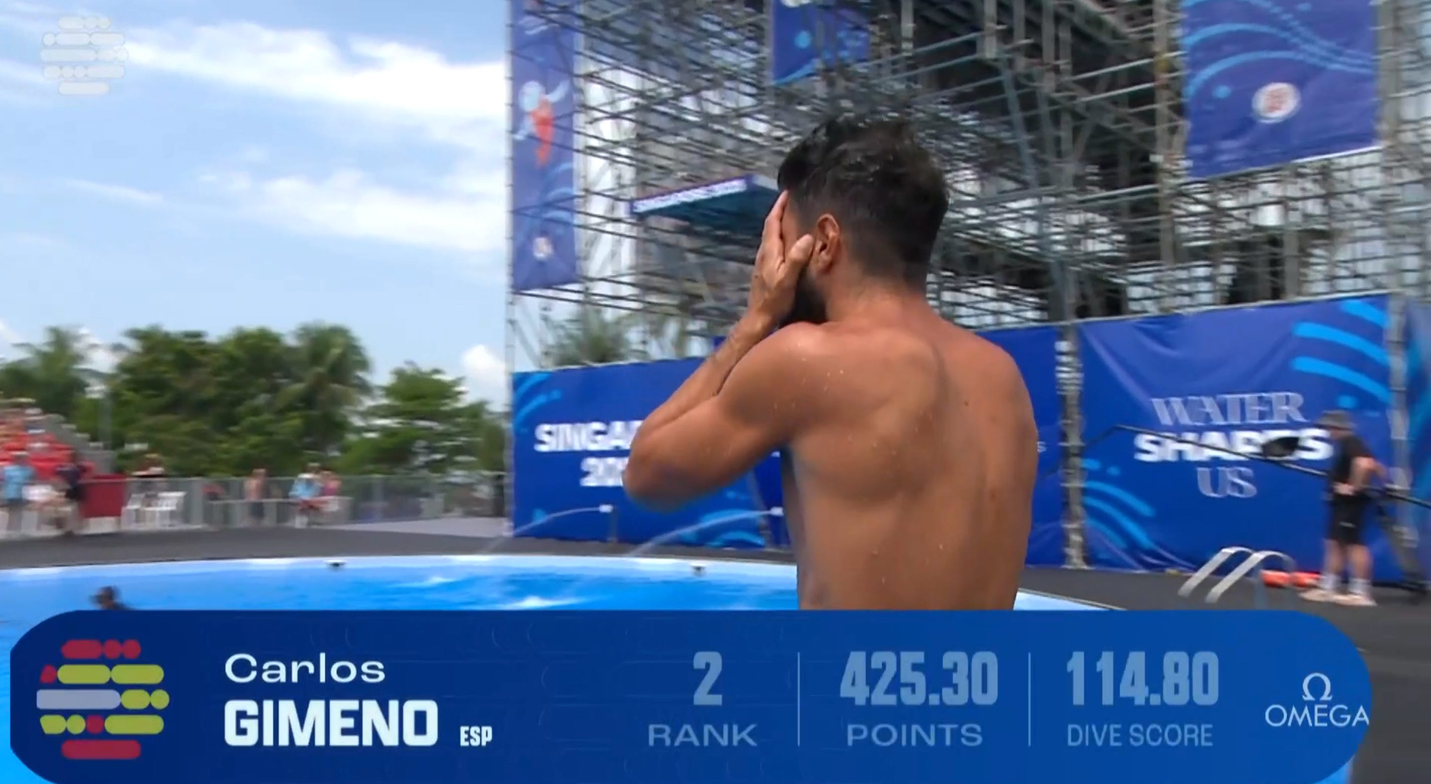 In the men’s 27m competition, Team USA’s James Lichtenstein won his first World Championship on the final dive of the competition … although it would be almost as accurate to say Spain’s Carlos Gimeno lost it. The two attempted the exact same dives throughout the competition and Gimeno led the whole way, but a sliiiiight over-rotation on the final dive gave Lichtenstein a 3.6-point win and the first American championship since 2017. Here’s Gimeno after the scores popped up: